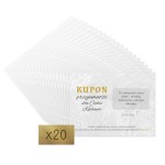 Zestaw kartek zdrapek – voucherów przyjemności to oryginalny i pełen emocji pomysł na prezent dla pary. W komplecie znajduje się 20 kart o wymiarach 10x7,5 cm oraz 20 złotych naklejek do zdrapywania, które pozwalają samodzielnie wypełnić treść każdego kuponu. Całość zapakowana jest w ozdobną kopertę z ekologicznego papieru kraft, co nadaje upominkowi elegancki, a zarazem naturalny charakter.